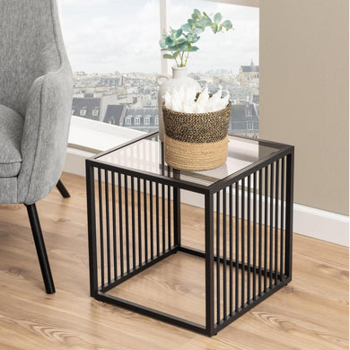 Strington Stylish Smoked Glass Side Table With Black Metal Bar Base 40x40cm