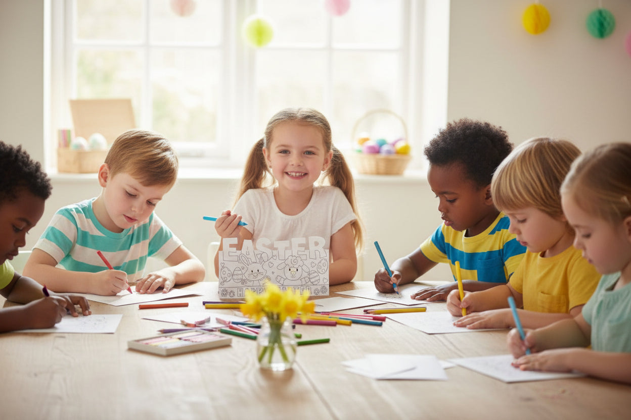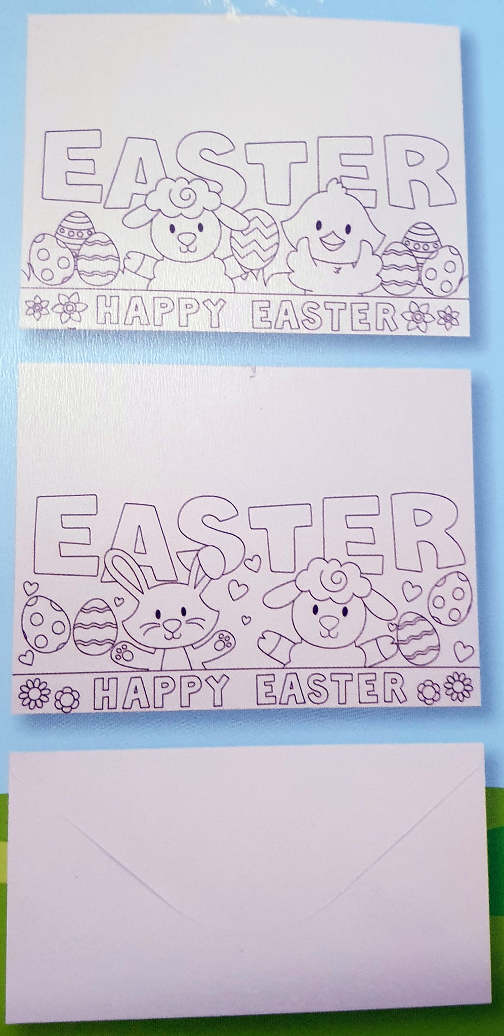 These delightful colour-your-own Easter cards offer a creative and personal way to send seasonal greetings. This set includes four blank cards in two charming designs, complete with matching envelopes and four vibrant felt tip pens to bring your artistic vision to life. Each card measures approximately 21cm by 10cm when folded, providing ample space for your colourful creations. The designs feature adorable Easter imagery including cheerful bunnies, fluffy sheep, decorated Easter eggs, and sweet chicks, all surrounding a 'Happy Easter' message with decorative flowers. These cards are perfect for children and adults alike who enjoy crafting and adding a personal touch to their Easter correspondence. The included felt tip pens in pink, blue, purple, and green provide everything needed to start colouring straight away. Whether you're looking for a fun Easter activity, a thoughtful handmade card to send to loved ones, or a creative gift, this set delivers both entertainment and practicality. The pop-up style design adds an extra special dimension to your finished cards, making them truly memorable keepsakes for friends and family this Easter season.