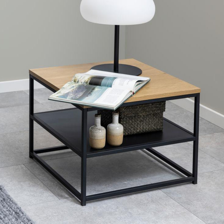 Gila square coffee table, top matt wild oak rough melamine, shelf black rough melamine, base matt black rough powder coated steel, 55x55x42 cm