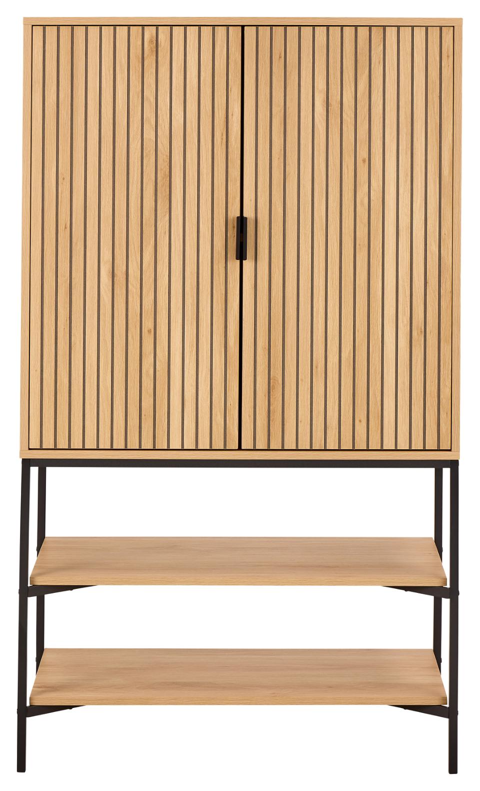 With its minimalist look, this cabinet is more than just a place to store your bits and bobs – it is a statement piece. The oak look and slatted front in combination with the black steel elements bring a modern contrasting look to any home. Featuring an easy to clean surface, the sideboard has 2 doors and 3 shelves and offers convenient storage.
