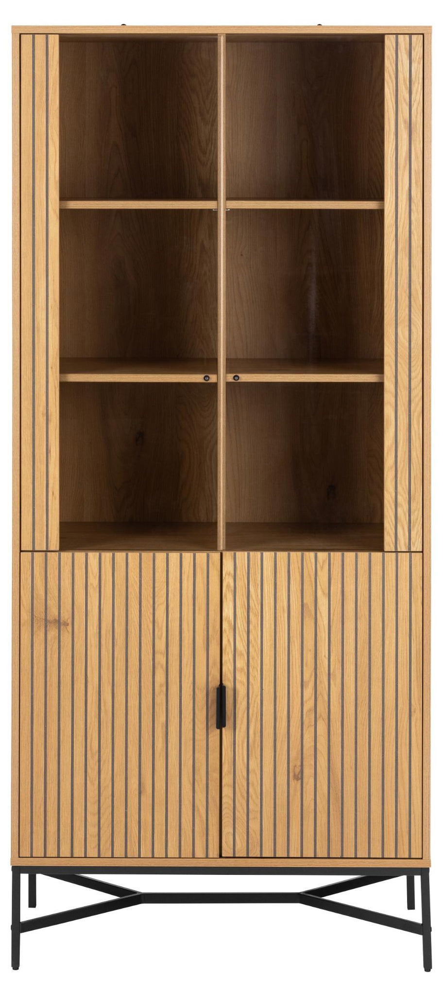 Jaipur display cabinet, top, frame and 6 shelves matt wild oak rough melamine, 4 doors matt wild oak rough melamine and clear tempered glass, base matt black rough powder coated steel with lamella front, 80x40x180 cm
