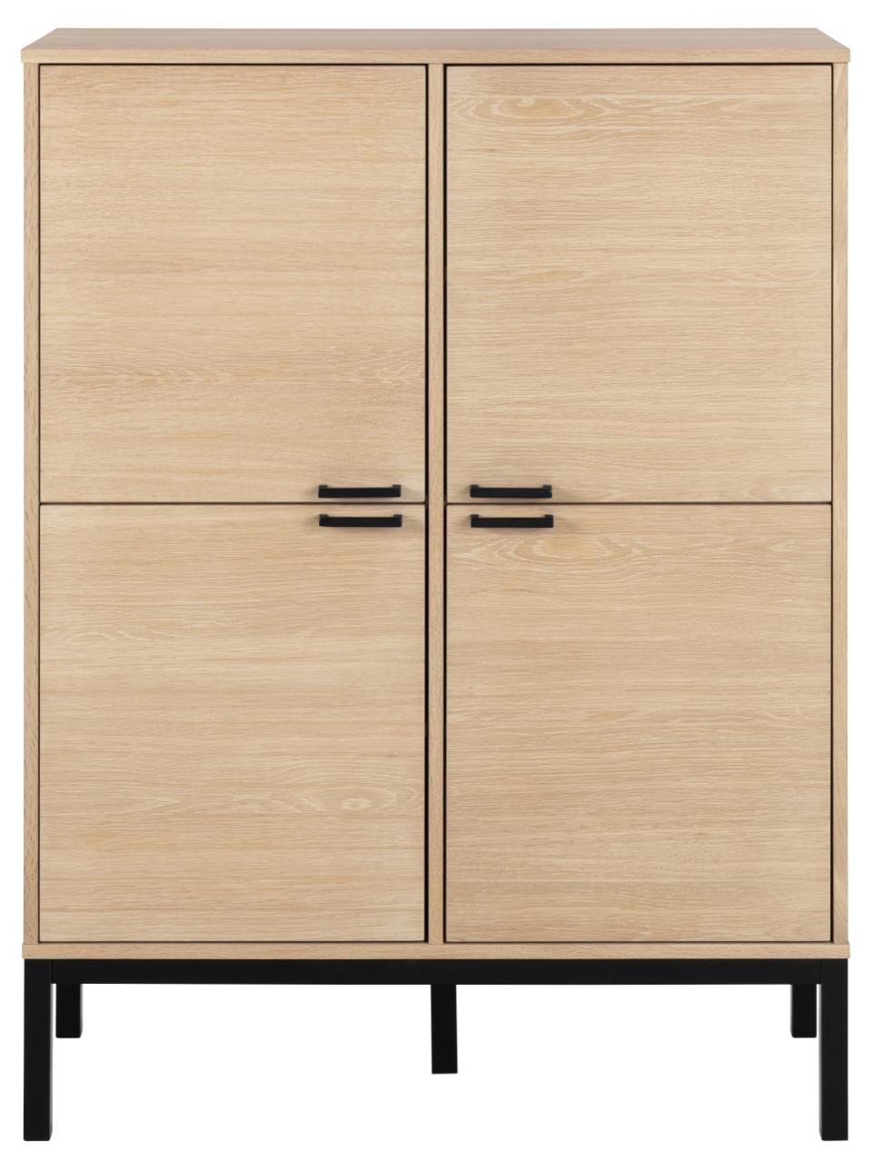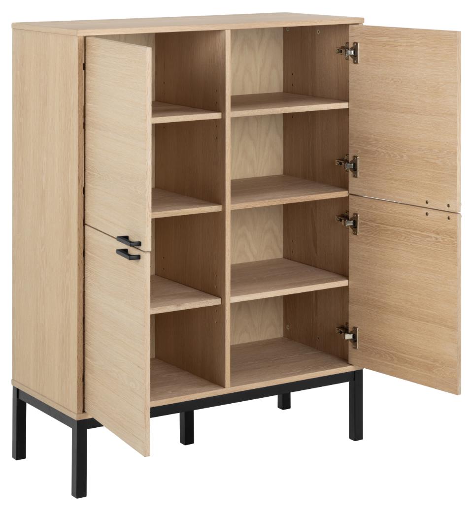 Kensington cabinet, top, frame, 4 doors and 6 shelves white pigmented oiled oak veneer, base matt black NC lacquered oak with lamella front, 91x40x120 cm