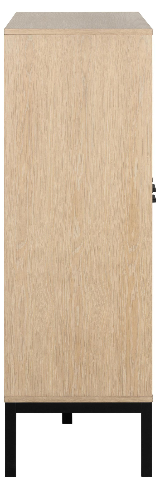 This striking cabinet invites a refreshing energy into the interior. Through its contrasting appearance, achieved by blending the white pigmented oiled oak veneer and black lacquered oak veneer, the cabinet enhances the dynamics in the room. It is designed with 6 adjustable shelves that are concealed behind 4 doors adorned with decorative lamellas.