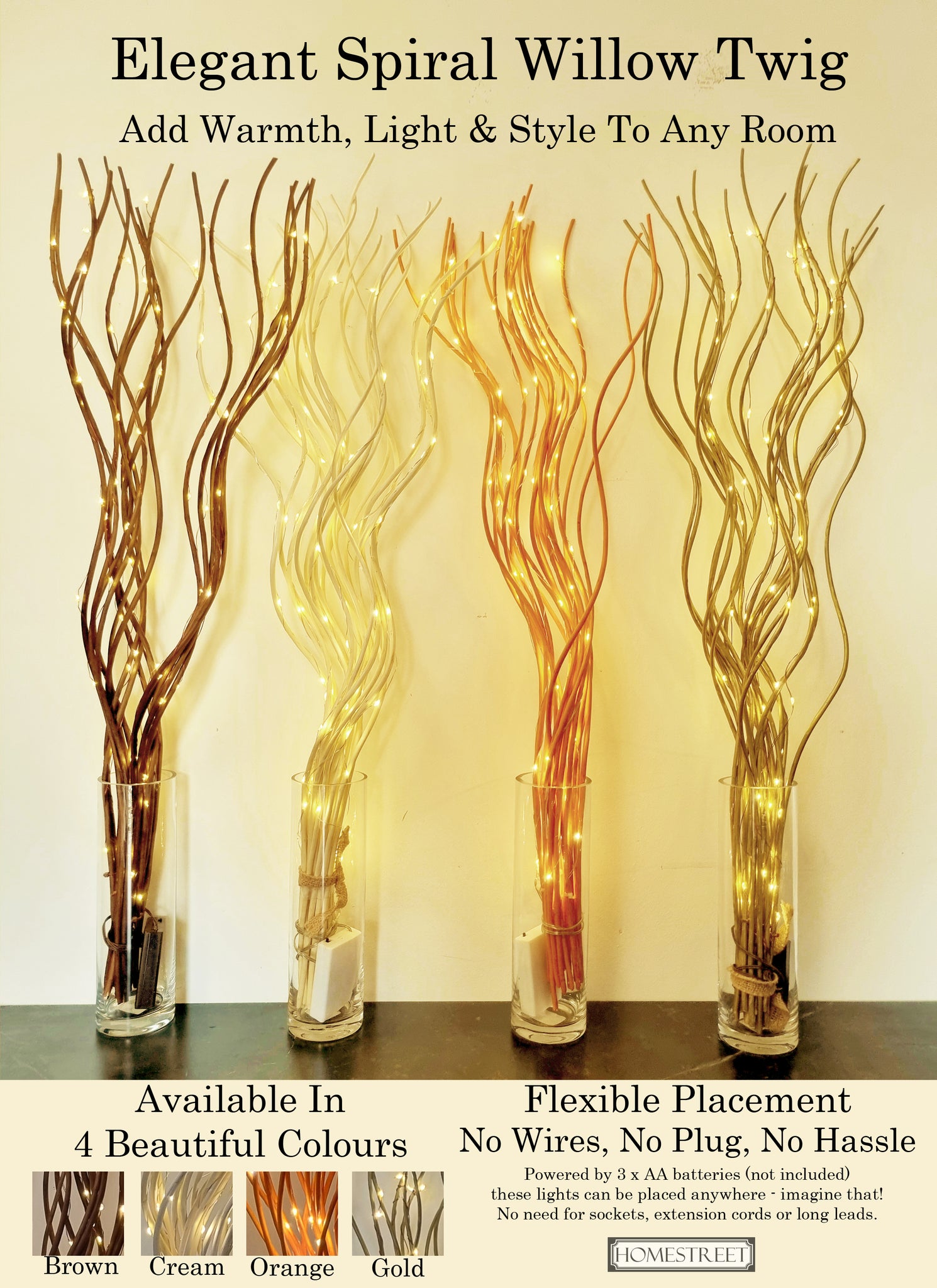 Stunning HOMESTREET Spiral Willow Twig Branch Lights – 80cm Decorative LED Light Twigs for Stunning Vase Displays, 80 Warm White LEDs, Place anywhere Battery Operated (3xAA), Available in Gold, Cream, Brown & Orange.